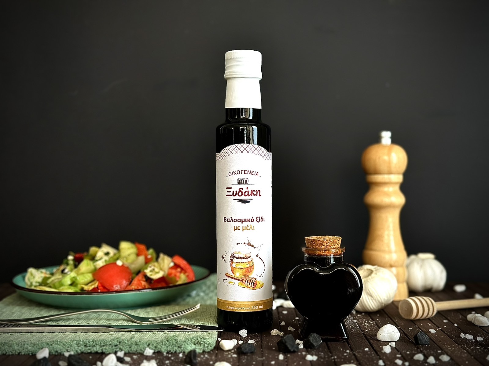 Балсамовият оцет с мед е вдъхновен от комбинация критска традиция, която съпътства семпли и оригинални творения. Неговият сладък и същевременно кисел вкус се съчетават уникално с месни ястия, пресни салати, сирена и риба.