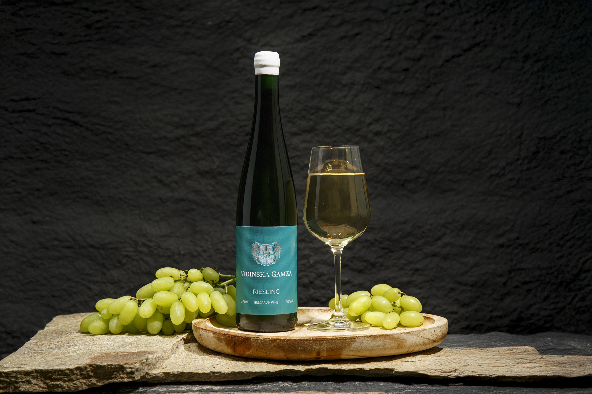 Вино от Ризлинг, произведено чрез контролирана ферментация при 15°C за 35 дни, с внимание към естествения характер на гроздето.