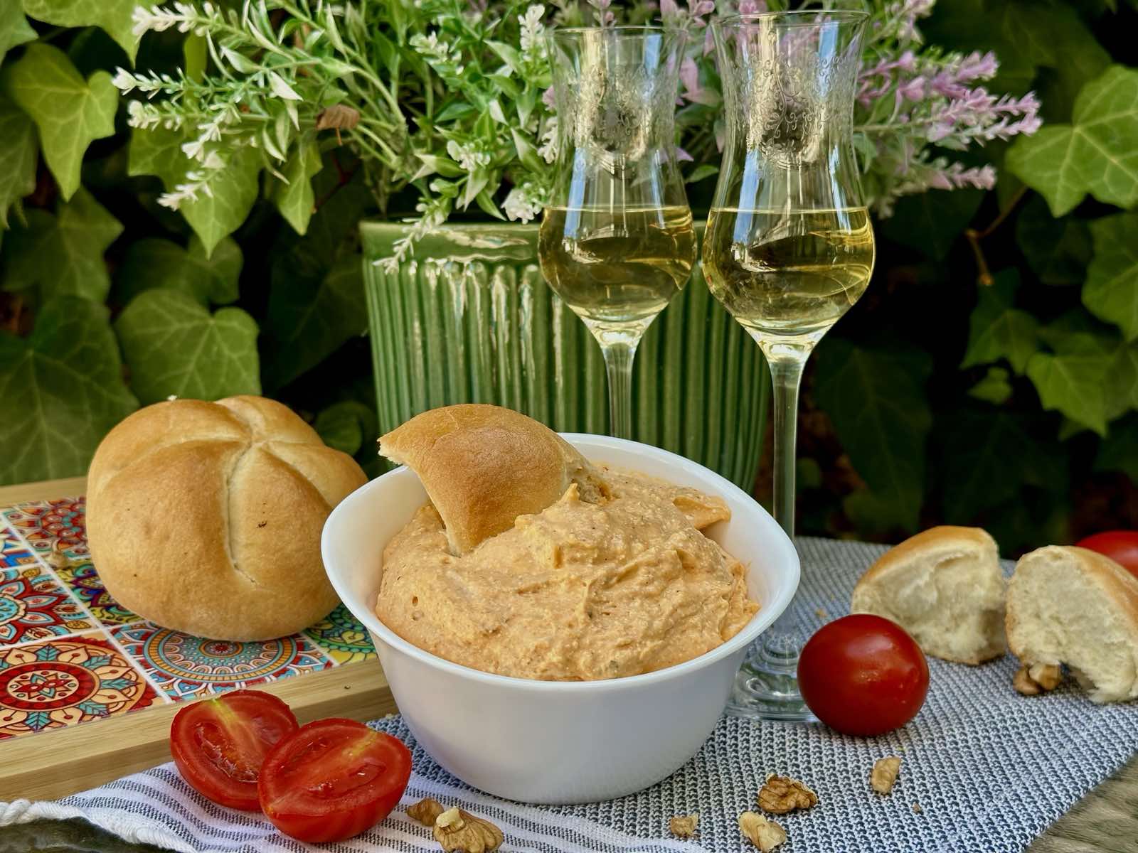 Бяло вино – Совиньон Блан или Асиртико (гръцко бяло вино, много добре върви с домати и маслини)